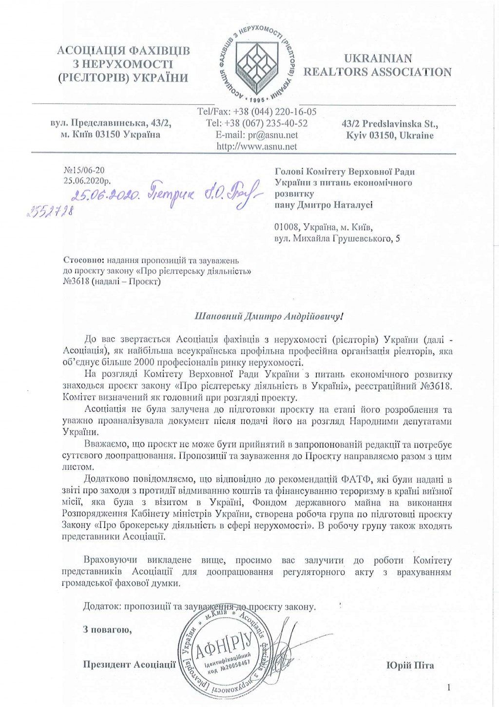 Асоціація фахівців з нерухомості (рієлторів) України направила звернення до Комітету ВРУ з питань економічного розвитку, який визначений головним комітетом при розгляді законопроєкту, стосовно проєкту закону «Про рієлтерську діяльність» та надала свої попередні зауваження та пропозиції.
