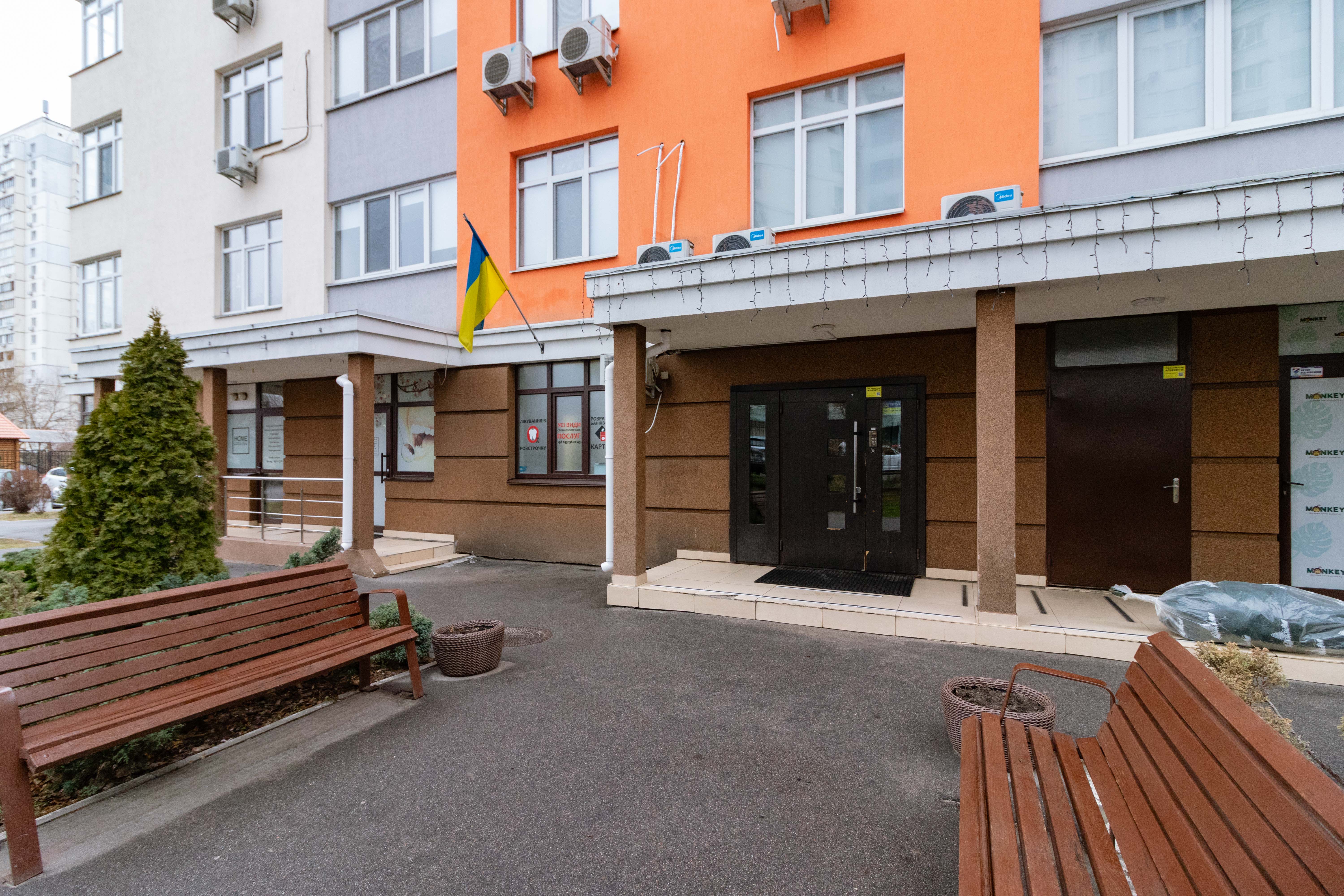 На території є дитячий майданчик, кав”ярня, продуктові магазини, стоматологія, спортивна студія.