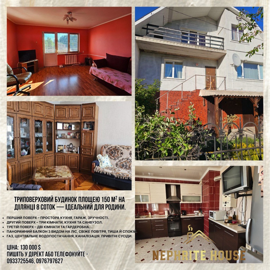 3 поверхи, 150 м², 8 соток землі.