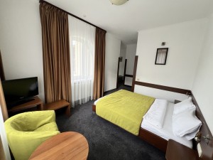 Пропонуємо готельний номер загальною площею 30,6 кв.м на третьому поверсі з виглядом на гори та річку Прут. Дві кімнати, одне односпальне та одне двоспальне ліжко, санвузол.
