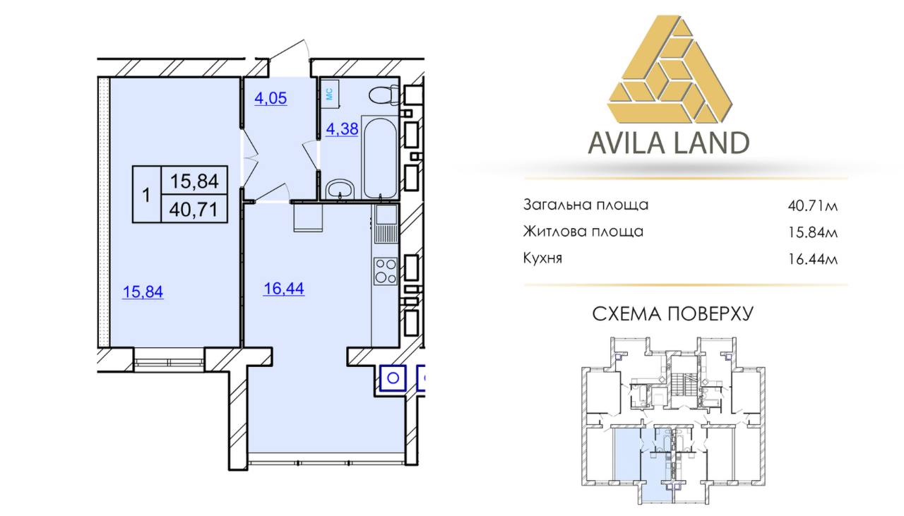 Площа: 40.71/15.84/16.44 м.кв