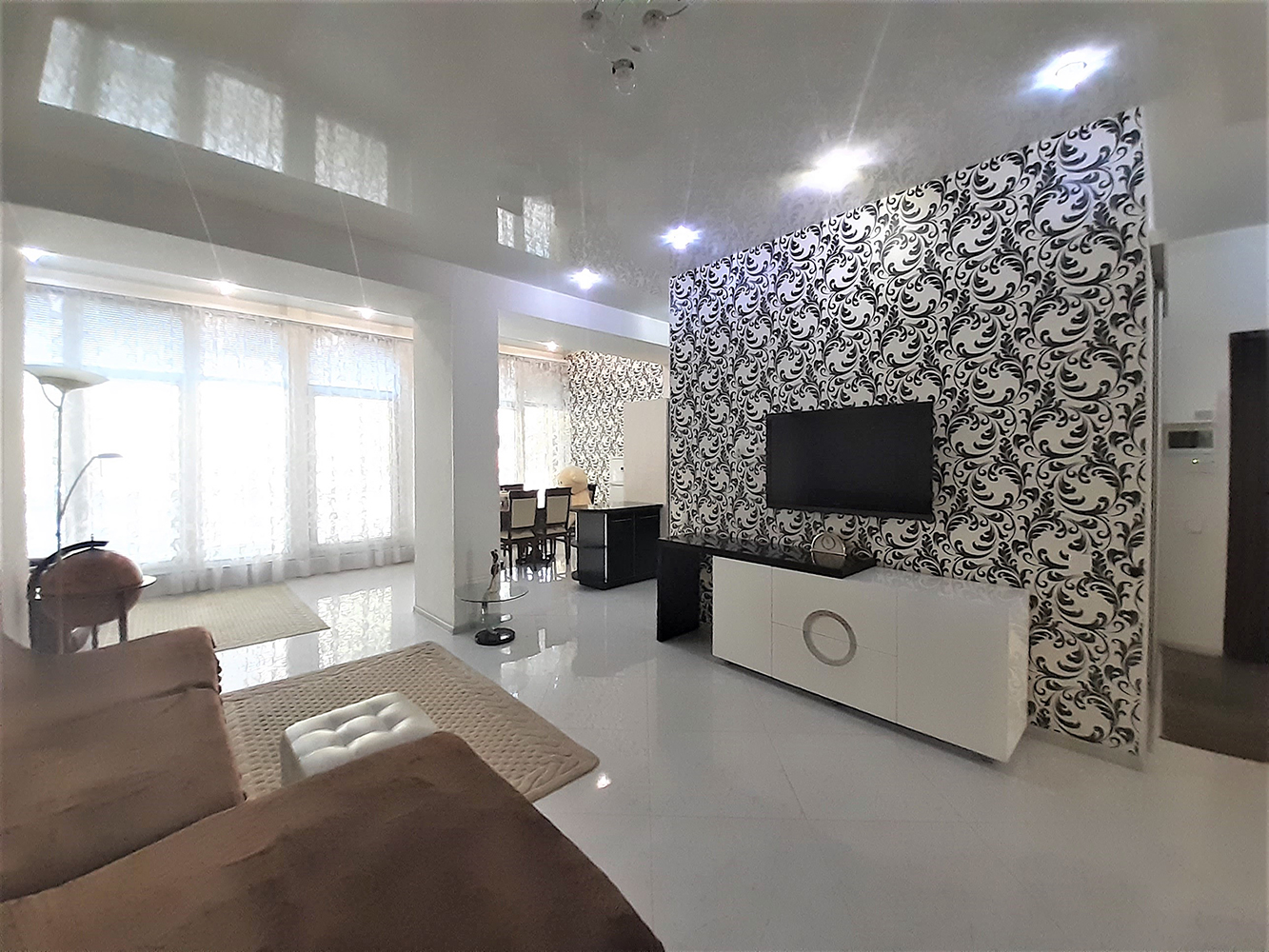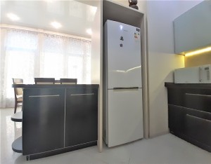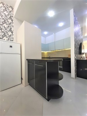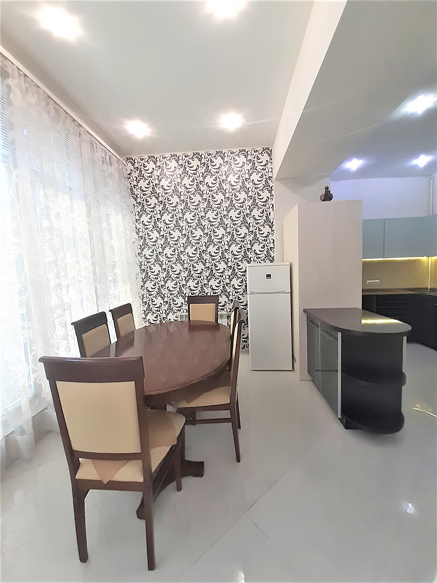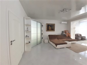 В квартире выполнен авторский ремонт с использованием качественных материалов. В гостиной панорамное окно во всю стену с тонированными стеклами, кондиционер, теплый пол, итальянские обои Roberto Cavalli, широкий диван, телевизор. Вместительная гардеробная в коридоре и угловой шкаф-купе в гостиной. Квартира с видеонаблюдением и сигнализацией. Установлены фильтры грубой и средней очистки воды, а также фильтр обратного осмоса. Встроенная кухня, холодильник, вытяжка, электрическая варочная поверхность и духовой шкаф. Остается встроенная мебель и техника, диван, тумба под телевизор (обеденный и спальный гарнитуры с письменным столом по договоренности). Перепланировка узаконена. Бонус: паркоместо во дворе.