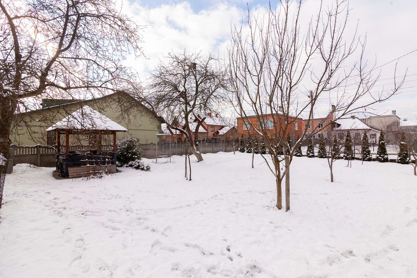 Будинок розміщення близько центру по вулиці Львівська, розвинена інфраструктура: школа, сполучення громадського транспорту, магазини, церква тощо. Будинок одноповерховий в хорошому стані, є все необхідне для проживання, утеплений, дах перекритий, залишаються вмонтовані меблі. В будинку 3 спальні, вітальня, кухня, санвузол, підвал. На території є гараж та літня кухня, альтанка, сад з молодими деревами, кущами, виноградом. Ділянка понад 12 сот по периметру загороджена та засаджена туями. Розмір та форма ділянки дозволяють будувати на території ще один будинок.