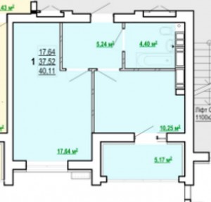 Загальна площа: 40,11 кв.м, окрема кімната - 17,6 кв.м, кухня – 10,25 кв.м із лоджією 5,17 кв.м. Квартира у будівельному стані.