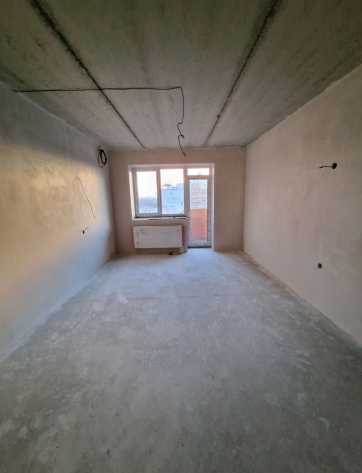 Стіни вирівняні (зроблено машинна стяжка), розведена електропроводка, зроблена сантехніка.