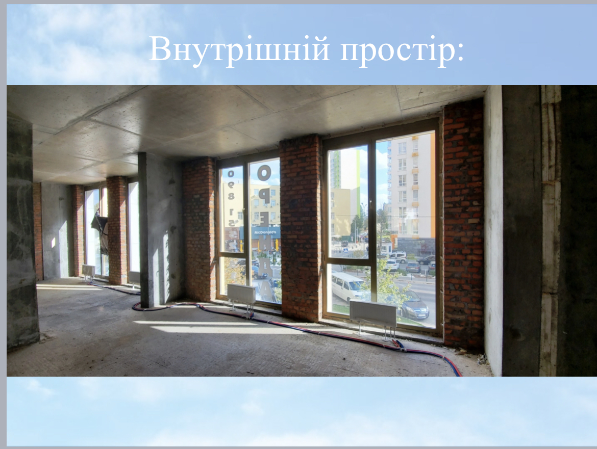 Вільне просторе приміщення з чудовим потенціалом розташоване в затишному житловому комплексі "San Francisco Creative House", вхід зі сторони "Нивки-Парк". Ця можливість ідеально підходить для реалізації ваших бізнес-проектів або створення комфортного робочого простору.